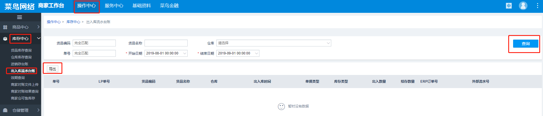 登入菜鸟后台后,点击“操作中心”->“库存中心”->“出入库流水台账”,进入后选择对应开始日期和结束日期,点击“查询”按钮后点击“导出按钮”,下载菜鸟单据后进行“导入菜鸟出入库流水”。